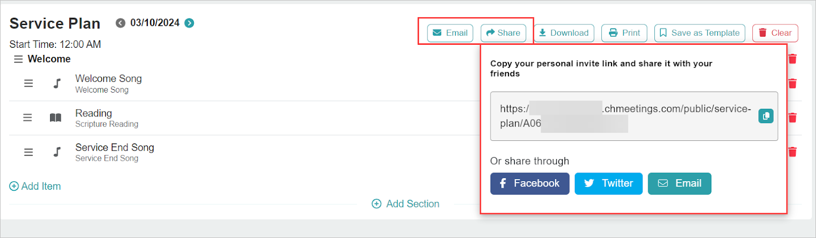 You can add Service Plans to your Events, and share them with people, separately from the event itself. If you’d like them to be accessible on your website as well, then you can link to them anywhere. Note that the event to which the service plan is attached must be public for the plan to be shared.