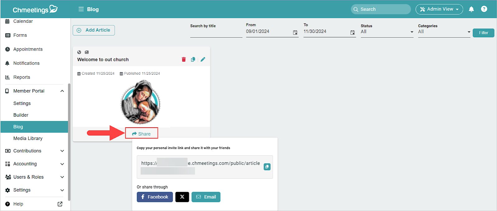 ChMeetings lets you publish a blog within your church app. Website visitors can read public posts without registering as members if posts are public, and you can add these to your website by linking to them.