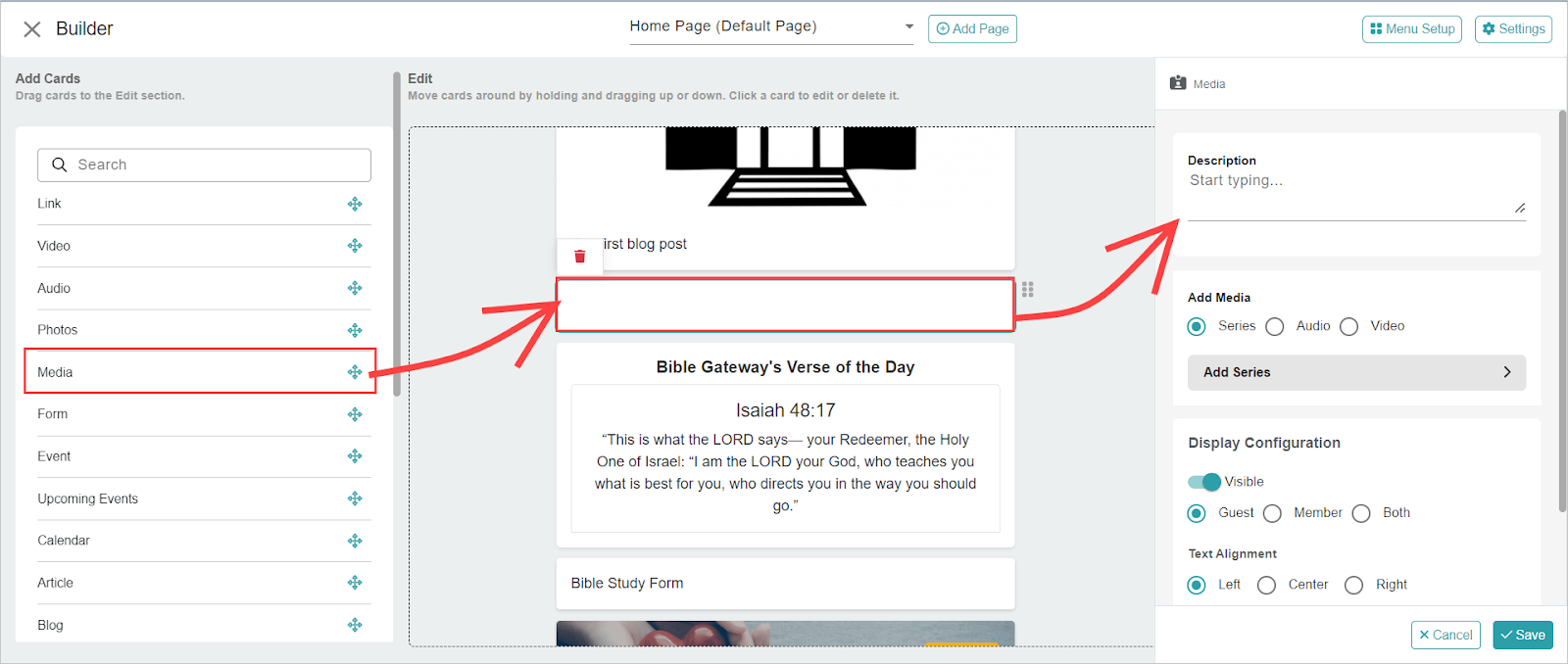 You can make media accessible to website visitors by using the Media Card within the App Builder, and making sure it is visible to Guests. You add this card to a page of your choice, then link this page onto your website.