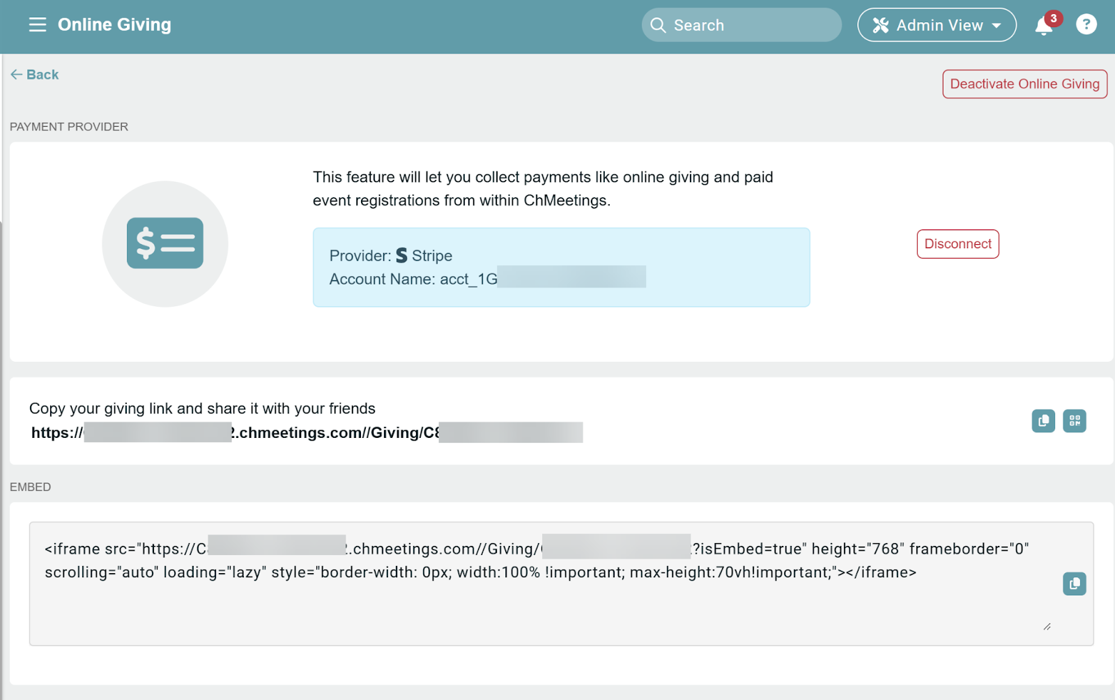 - Stripe comes with both a direct giving link that members can click on to reach your online giving page, and with embeddable code. When you embed your online giving code, members no longer have to leave the page to reach giving options; they can find them right on your website, along with other relevant content.