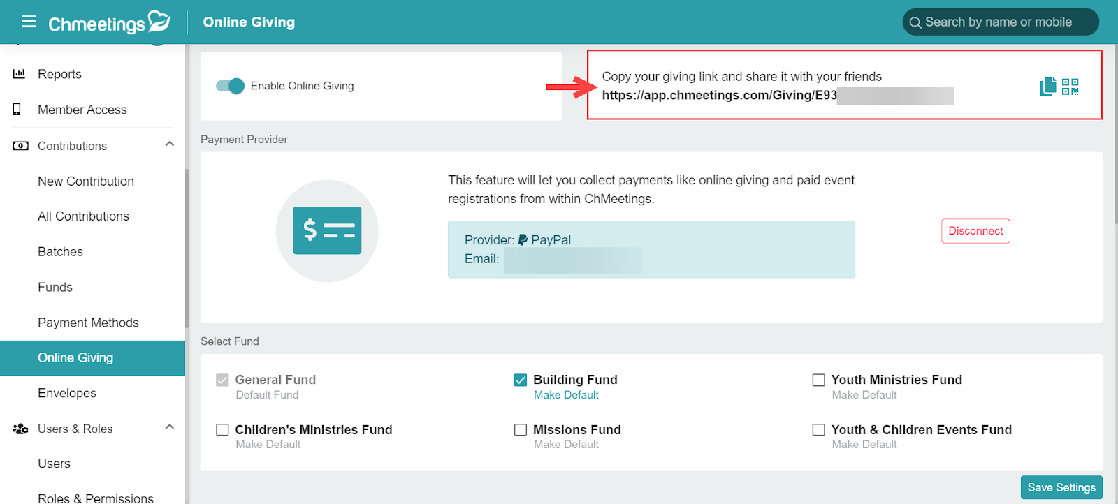 - PayPal: ChMeetings provides a direct giving link that members can click on to reach your online giving page. You can add it to your website as a text link, place it behind a button, or any other web object you prefer. You can even copy a QR code that points to this link to make it easy for members to give to your church. Learn more about online giving.