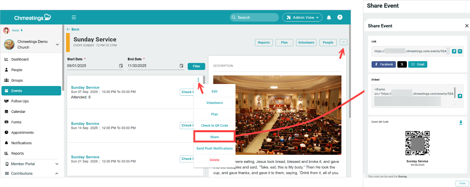 You can embed Events to your website by copying the event’s embed code from under Events > Select Event (Find Occurrence if recurring) > Options Menu > Share. Learn more about sharing events. Note that events must be public to be embedded to your website.