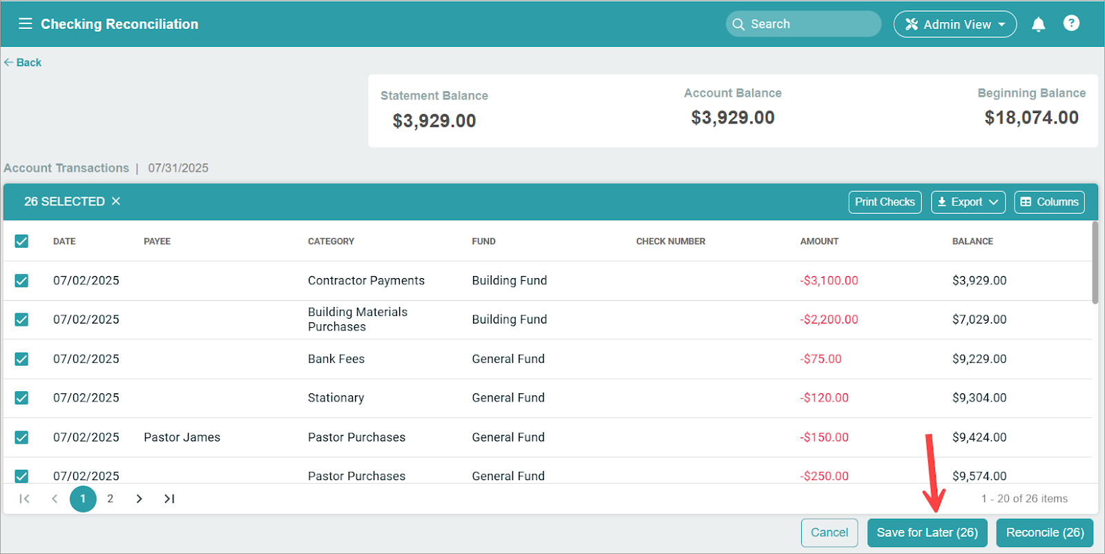 The Save For Later option at the bottom of your reconciliation transactions list allows you to save any changes you made to the reconciliation process and restart it later, from where you left off.