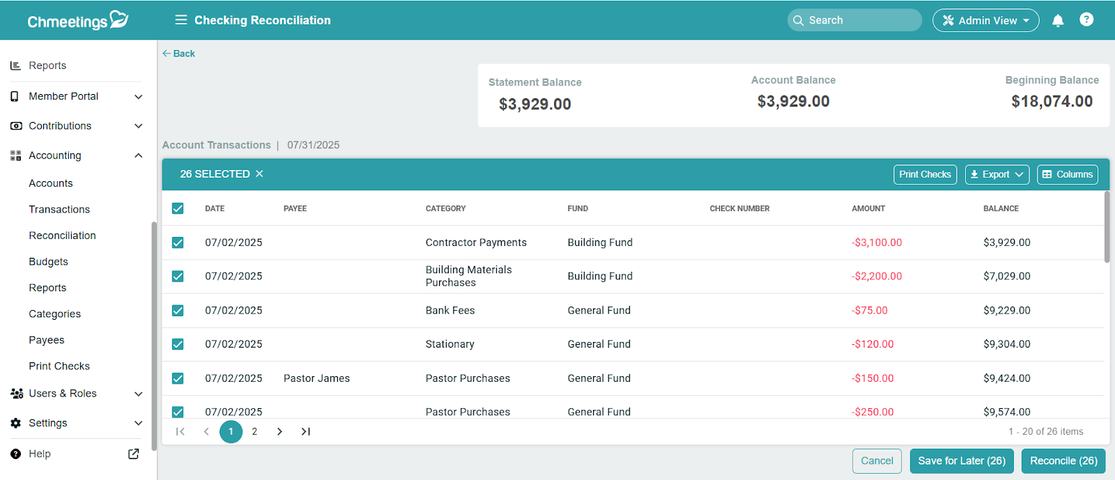To reconcile specific transactions, then the ending balance from your bank statement should be the same as the total amount of those transactions within ChMeetings.