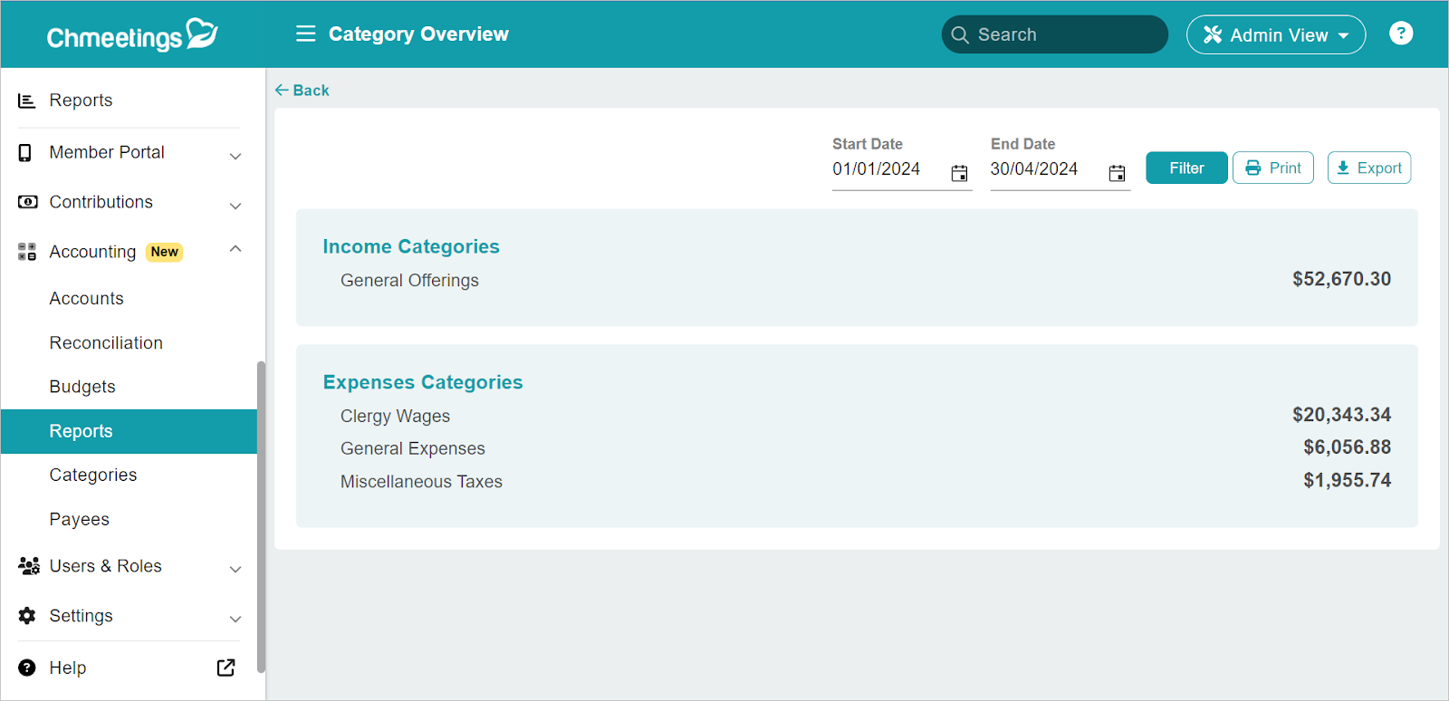 If you organize your income and expenses into dedicated Categories and Funds, then you can track total income and expenses per Category and Fund.