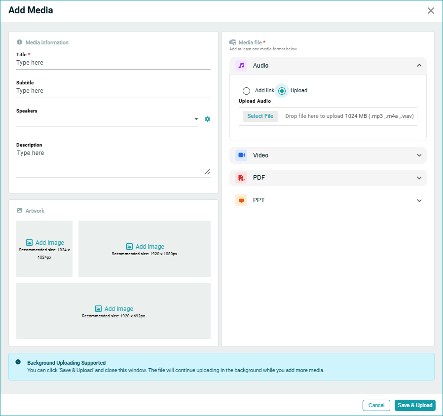 Upload artwork to accompany your content when published for your audience. This artwork will also be shown within your media library, next to the content item.