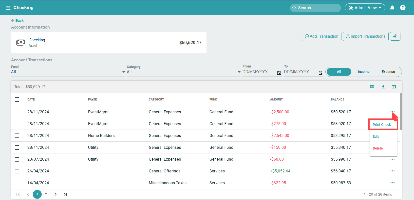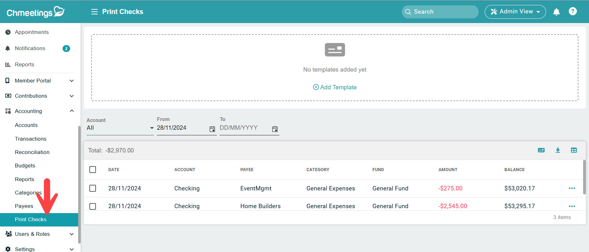 The Print Checks feature lets you easily print transaction data onto paper checks, using ChMeetngs’ Accounting module.