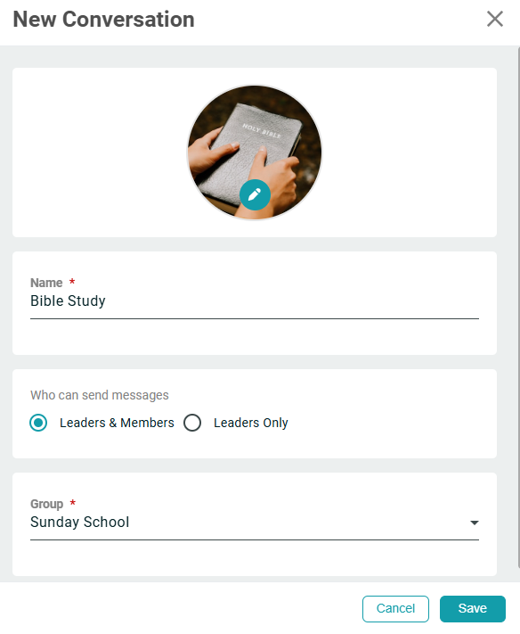 - Photo: Browse your device and choose a representative photo for the conversation.