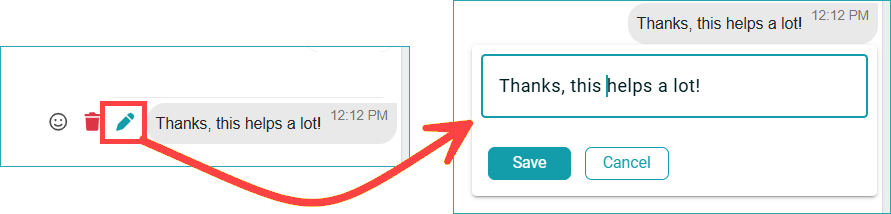 To edit a message, hover over it to reveal the Edit (🖉) icon. Click it, edit your text, then Save.
