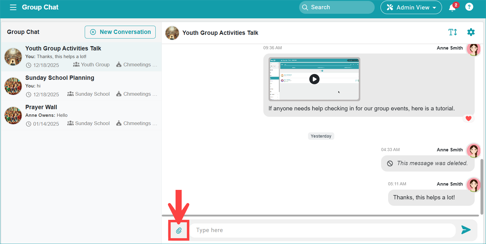 Group Chat allow Group Leaders and members to chat with each other within the group. This helps facilitate communication and information flow so your church can better connect with people, organize group events, make announcements, and more.
