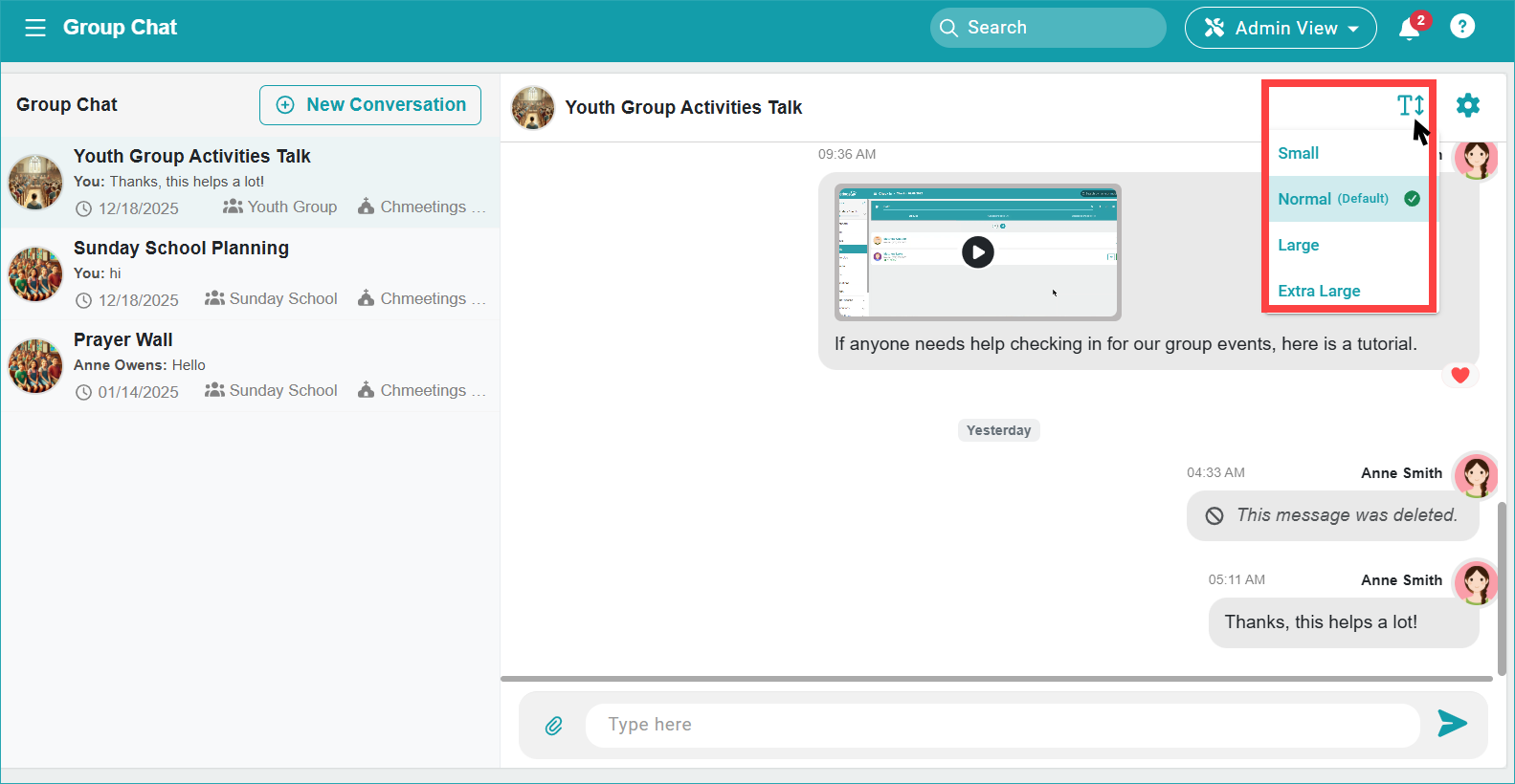 Find the Font Size () icon at the top of your conversations, next to the Settings (⚙) icon. You can choose between Small, Normal (Default), Large, and Extra Large. The size you choose remains saved until you decide to change it.