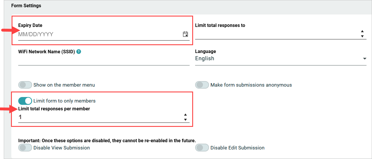 - Enable "Limit form to only members" and set "Limit total responses per member" to 1, so each member can submit only once.