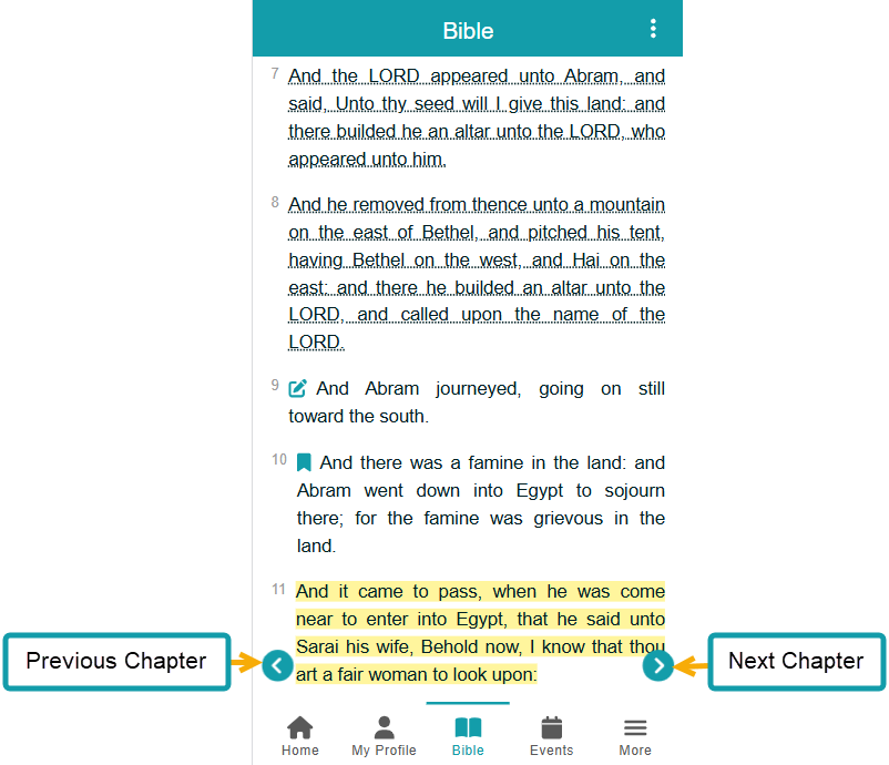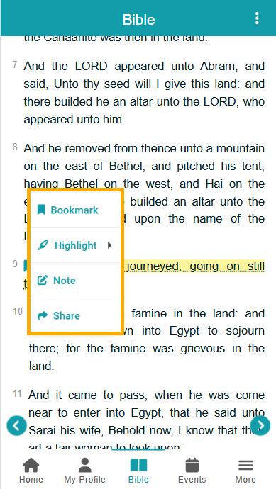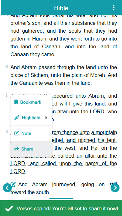 - Chapter Verses. Here is where you can read verses, and if you tap on one, you get a menu that lets you bookmark, highlight, add a note, or copy the verse to share.