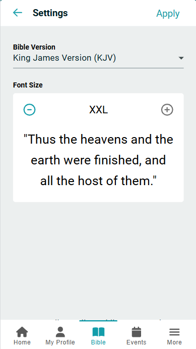 - Settings, where you can set the Bible Version and Font Size.