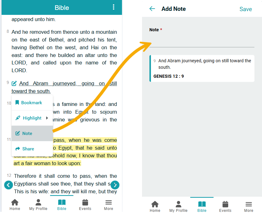 Tap a verse and select Note to add a note to it. Enter the text, and tap Save. You can add multiple notes to the same verse by following the same process.
