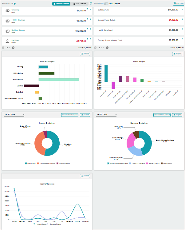 - Income Breakdown: Displays a breakdown of income per Fund. You can filter the chart by the last 30 days, this month, or this year; as well as view the Category Overview Report for further details.