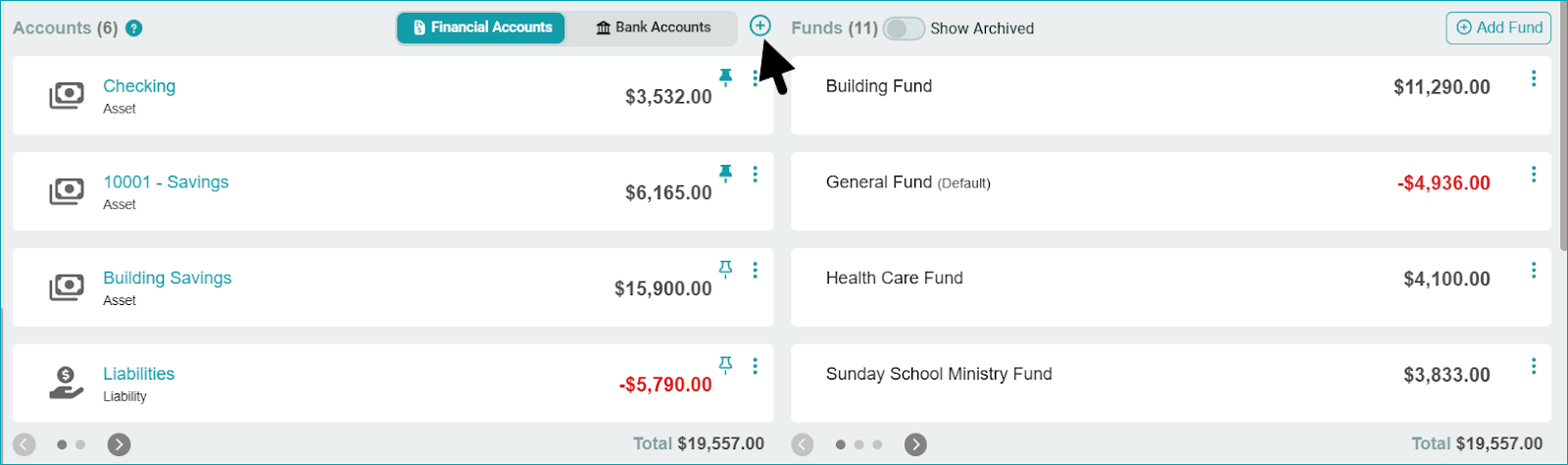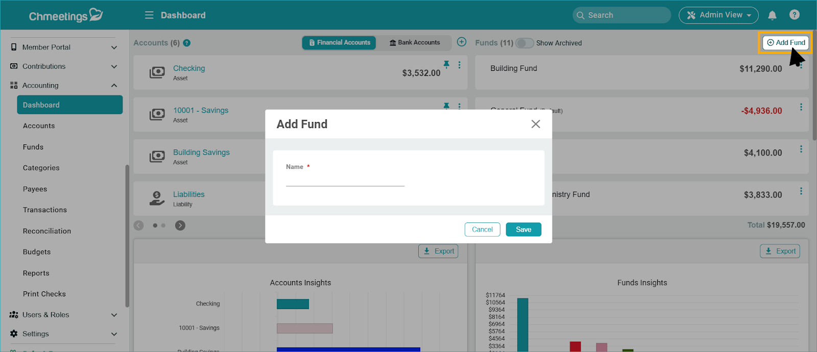 Add Funds: Click Add Fund at the top right of your list of funds, enter the name of your new Fund, and Save. That’s it! Your fund is now added.