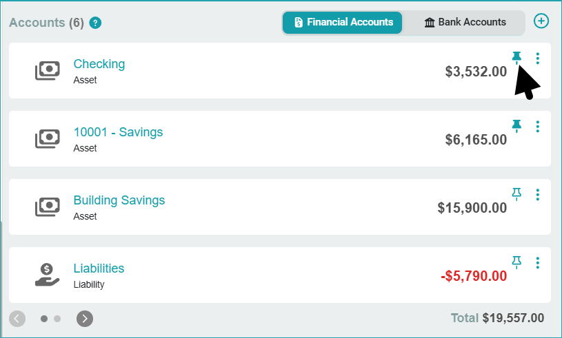 Pin Accounts: Use the Pin icon next to each account to keep it on-screen regardless of activity. This is useful for accounts you use frequently or need to keep an eye on.
