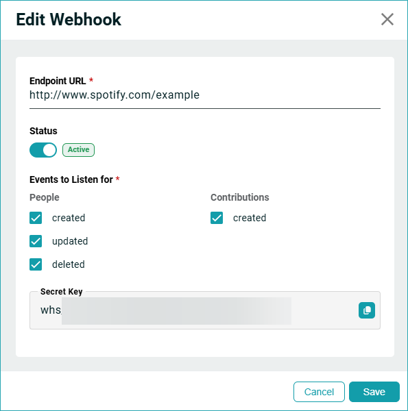 When editing a webhook, you can also retrieve the Secret Key, which you can use to distinguish calls coming from ChMeetings. You can also disable the webhook, as needed.