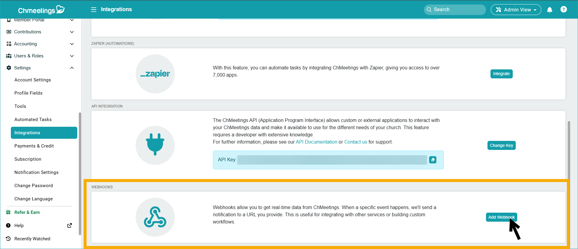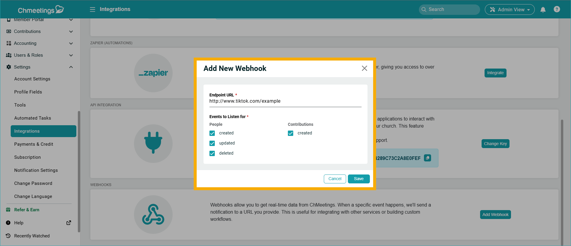 Webhooks are a tool that allow you to send notifications outside of ChMeetings when something happens in Chmeetings. This is helpful when integrating with other services or creating workflows based on these notifications.