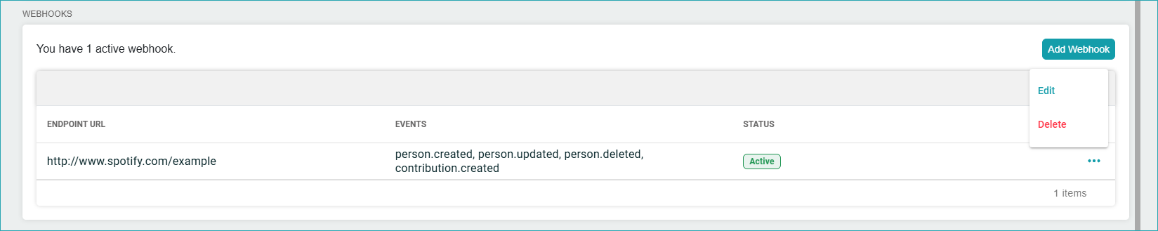 Once the webhook is created, you will see it listed, and you can edit or delete it.