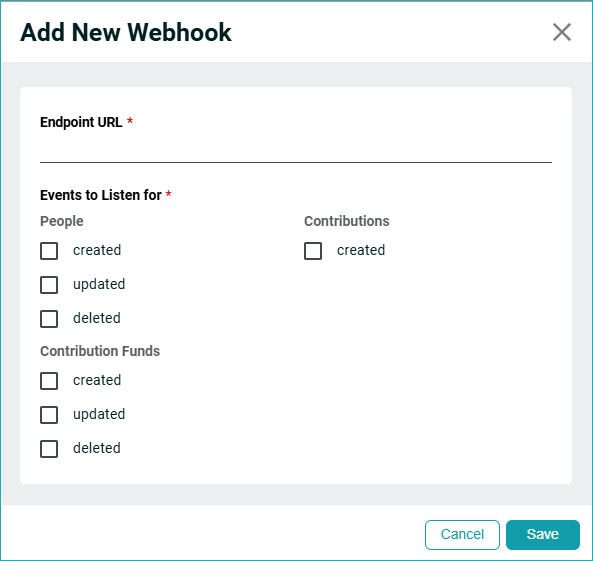 - Next, select the Events to listen to. You can choose to send notifications when People are created, updated, or deleted; when Contributions are created, or when Contribution Funds are created, updated, or deleted.