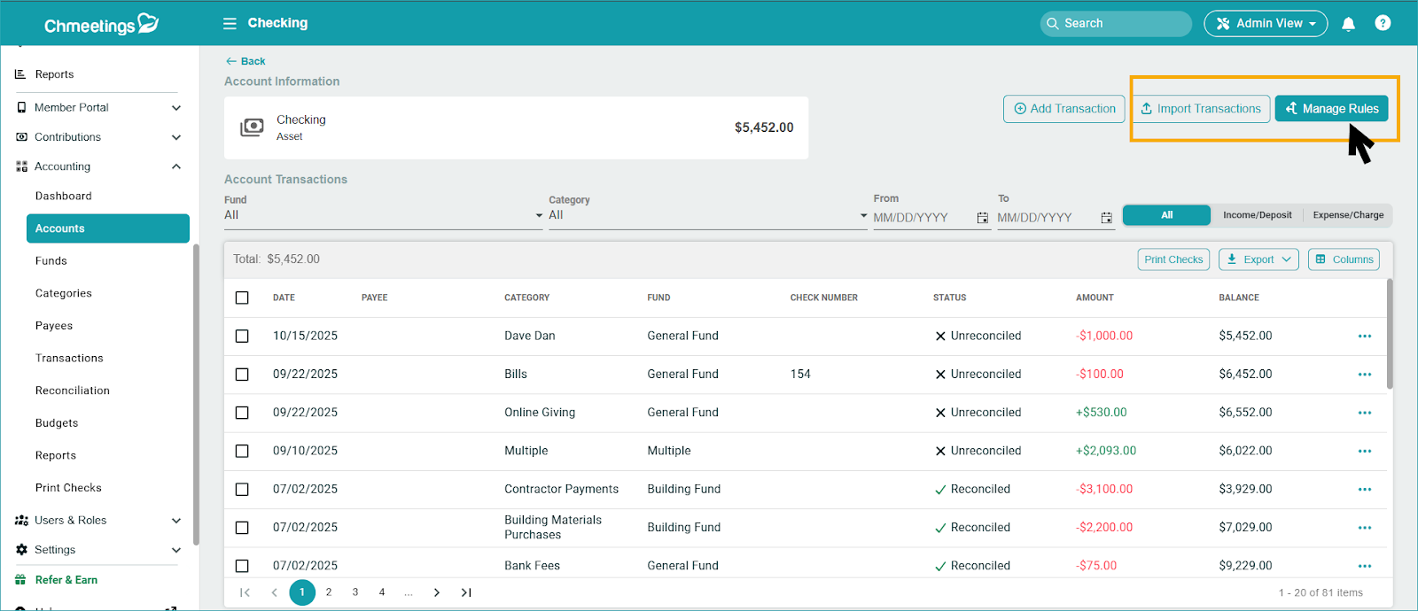 Rules are part of the Transactions import process within ChMeetings Accounting.