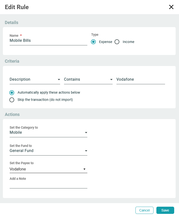 - Automatically apply these actions below, which lets you set the Category, Fund, and Payee to allocate the transaction to, once imported. You can also add a note to transactions imported via the rule. Notes are imported as line item notes (not as transaction memos). If an imported item already contains a note, then the rule will NOT overwrite it.