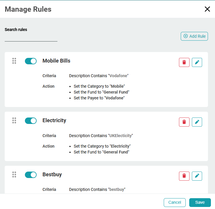 Import Rules apply to both manually imported transactions, and to those imported directly from your bank account, if linked.