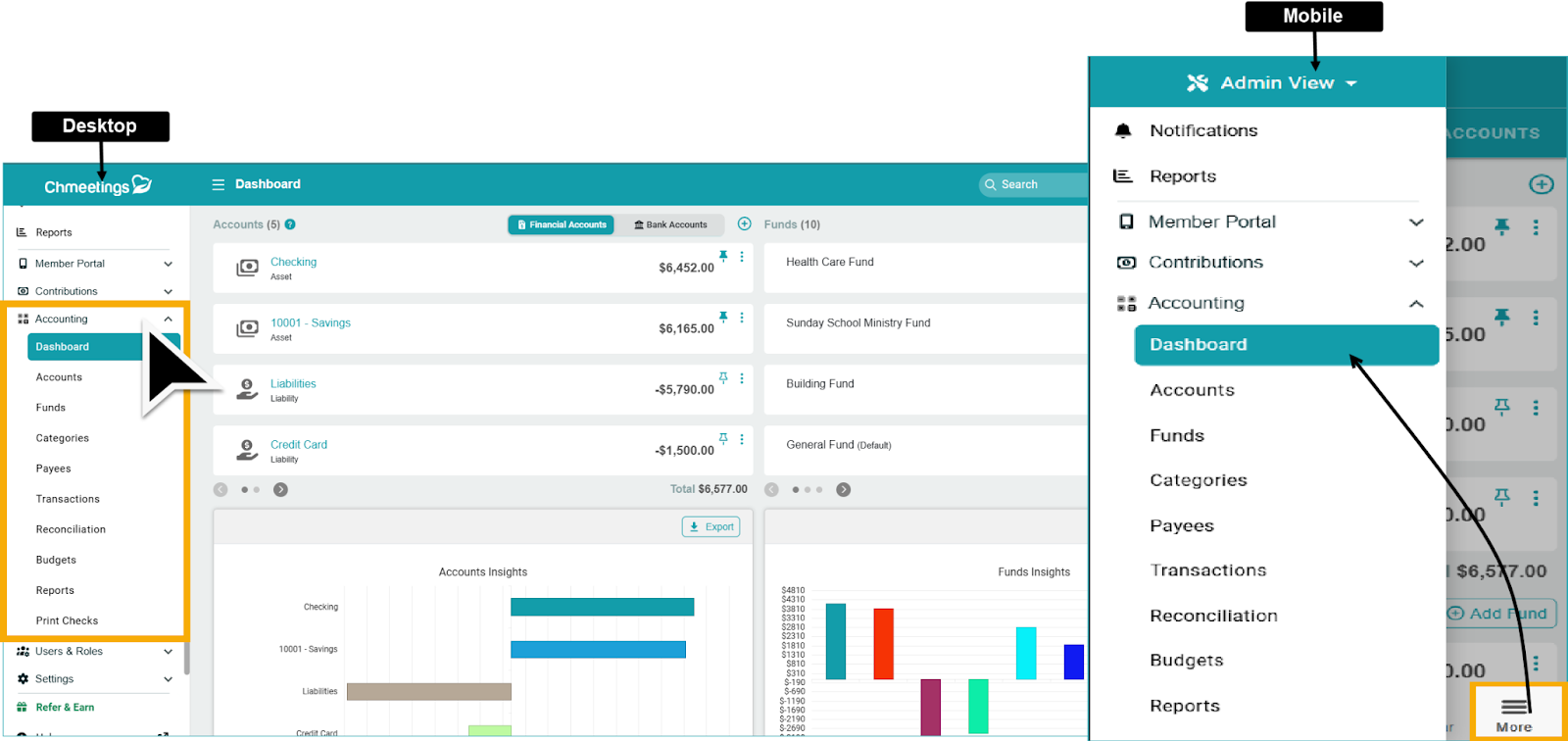 To reach the Accounting section, check the main ChMeetings Menu.