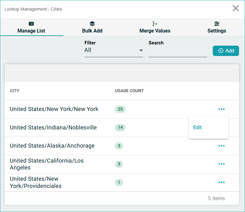 View the list of all Cities that can be used within your People database, along with Usage Counts for each city.