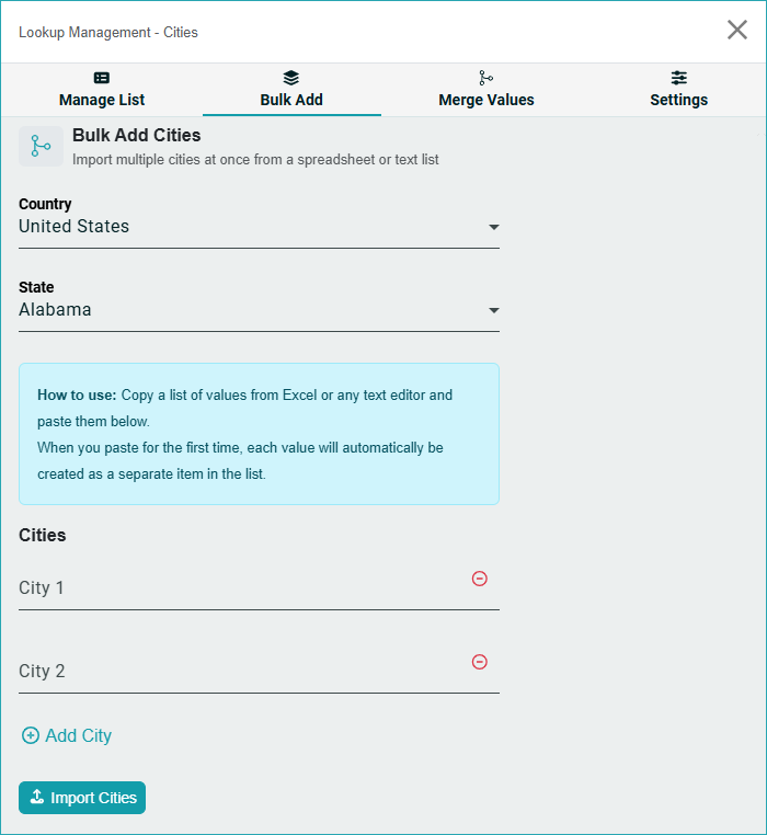 Add cities in bulk by pasting values from Excel or a text editor.