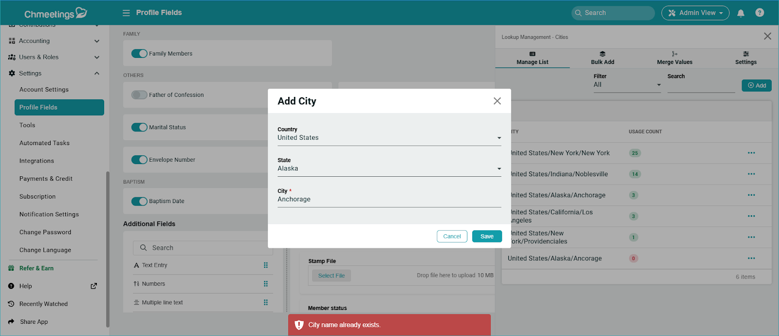 The City field lets you manage the cities that display within Member Profiles as options to choose from when entering addresses. Here is how to work with the City field to best manage this aspect of your church work: