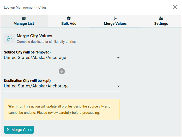 ⚠️ Warning : This action will update all profiles using the source city and cannot be undone. Please review carefully before proceeding. |