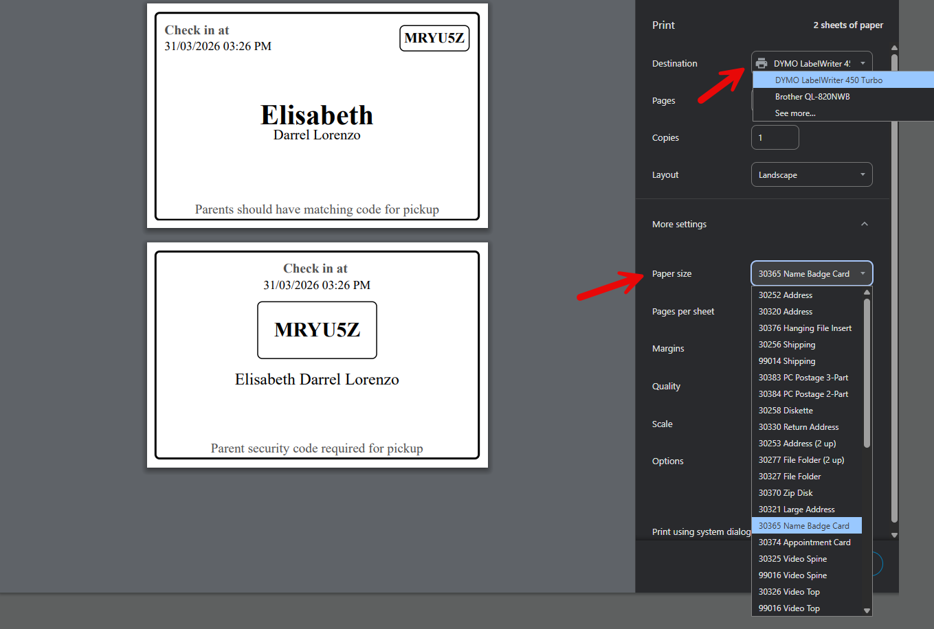 Click on More Settings and use the Paper size dropdown to select your specific label (e.g., 30365 Name Badge Card).