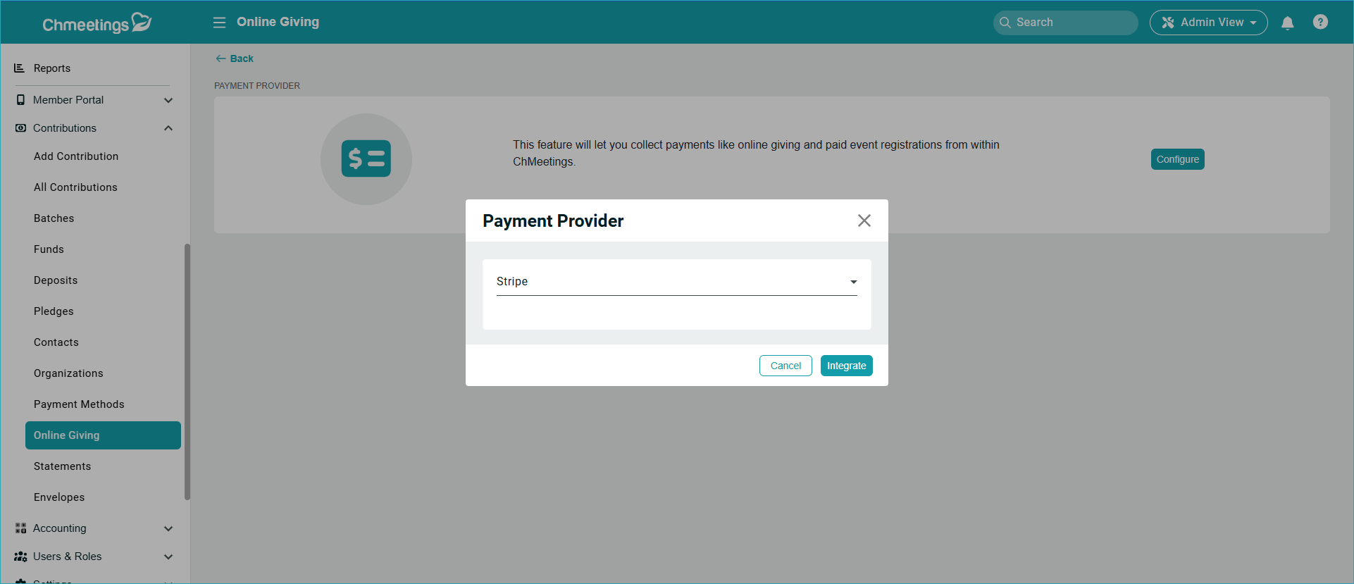 Online giving (one-time or recurring) is available through PayPal and Stripe. You can configure your payment provider by clicking Configure.