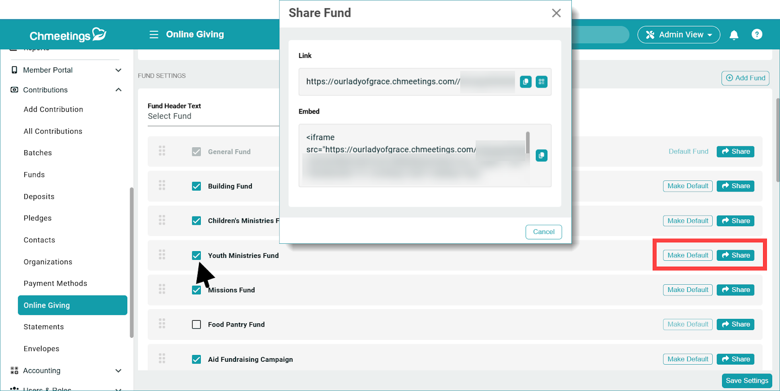 The funds you select will be displayed to members when they give via your ChMeetings giving link, so they can select where their donation should go.
