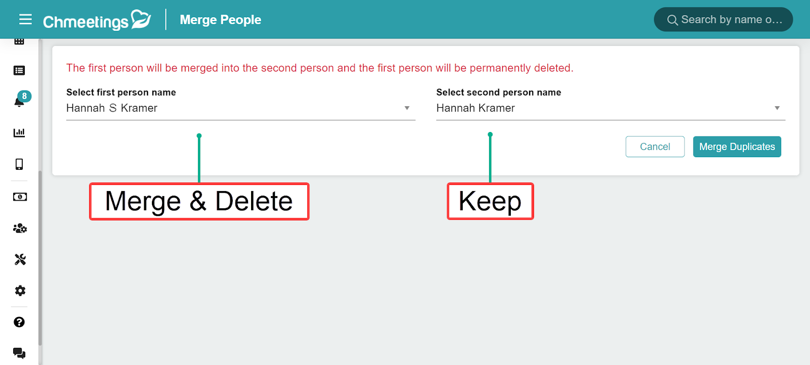 Sometimes, it can happen that two ChMeetings profiles are created for the same person. While avoiding this situation completely isn’t always feasible or simple, it’s something easy to remedy, using the Merge People feature. It allows you to search for duplicate people by name, email or mobile number to merge them into one profile. The merge includes their attendance, notes and follow ups, as well as text messages, emails and contributions. The feature shows you a list of duplicate people and you can easily choose how to merge. To get started, go to Settings > Tools > Merge People.