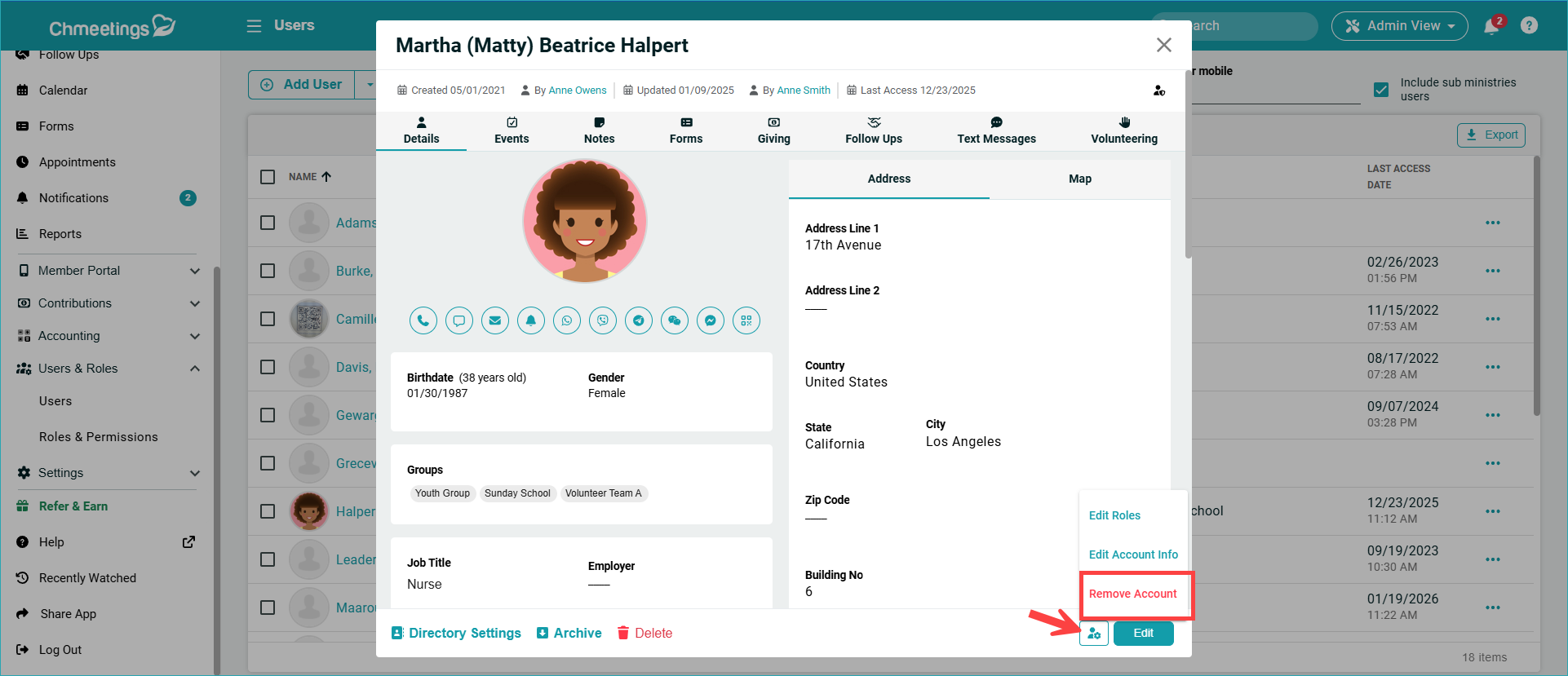 If you know exactly who has a duplicate profile, this feature is very useful to quickly merge into one. The merged profiles will include attendance, notes and follow up data, text messages, emails and contributions, along with other profile information.