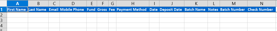 Please populate at least the First Name, Last Name, Email or Mobile Phone, Fund, Amount, Date, and Batch Number to have contributions associated with the right member, fund, payment method, etc. The tool allows you to import without the First & Last Name, Email, or Mobile Phone fields, but the contribution will be recorded as anonymous.