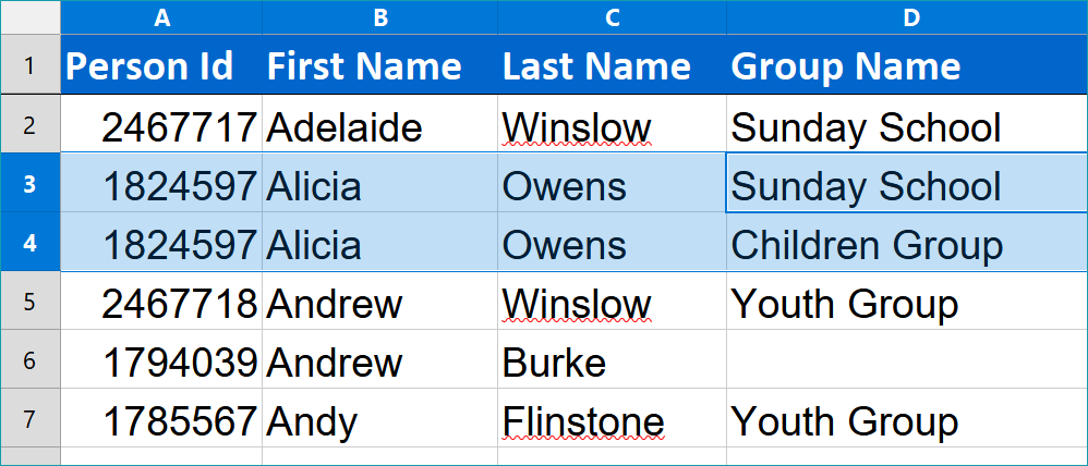 Person Id: Autogenerated, mandatory field. Please do not modify it, as this is the most important column in the spreadsheet. If the person’s name does not match a ChMeetigs profile, then the record will be matched based on the Person ID.
