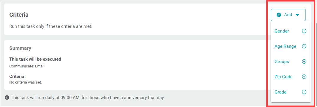 - Set the task Criteria. This is where you choose what set of people the task will apply. You can filter by Gender, Age Range, Groups, or Grade. Task Criteria are optional; and if you do not set any, the task will apply to all people.
