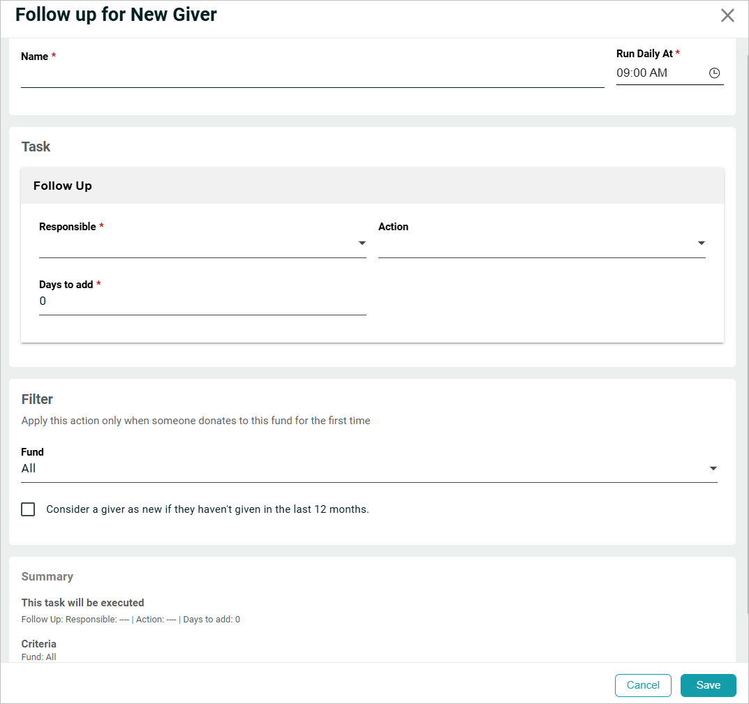 Follow up for New Giver: Automatically create a follow-up when someone donates to a specific fund for the first time. This task runs daily at the scheduled time for all new givers.