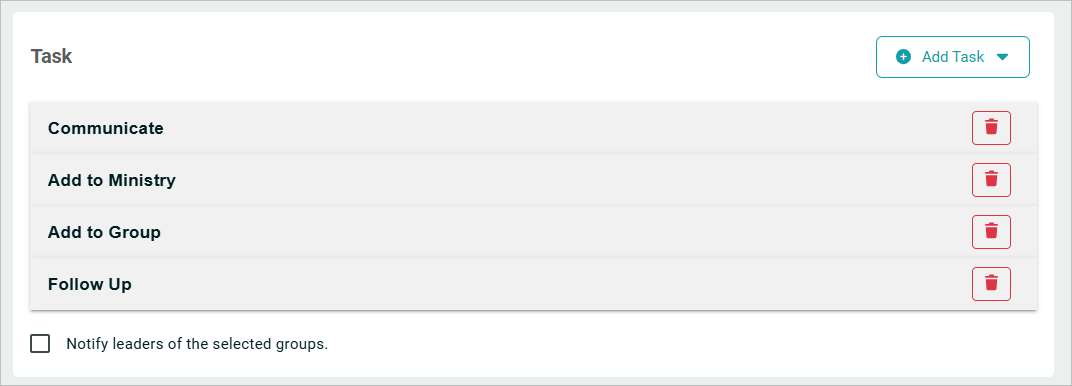 Configure the Task to execute. There are four task types available and you can set each of them once per task. So, you can create one task that sends a message to people, adds them to a ministry, adds them to groups, and creates a follow-up, all in one go.
