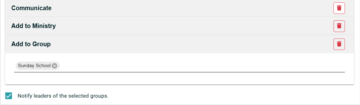 Add to Group: This action automatically adds newcomers to a selected group. When you choose to run this action via an automated task, you can also notify the group leaders about the new people being added.