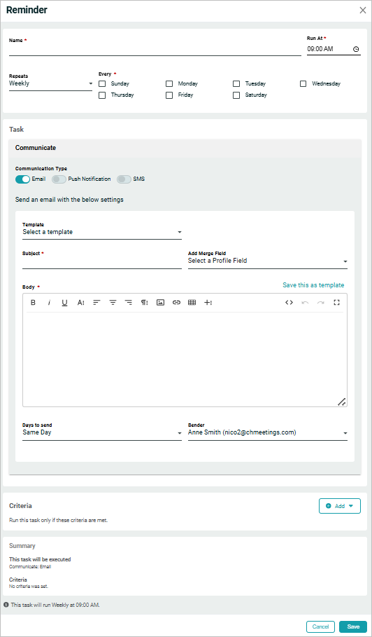 Reminder: Send reminder emails, push notifications, and SMS based on a schedule and a set of criteria. This task runs according to the set schedule for all people who meet the set task criteria.