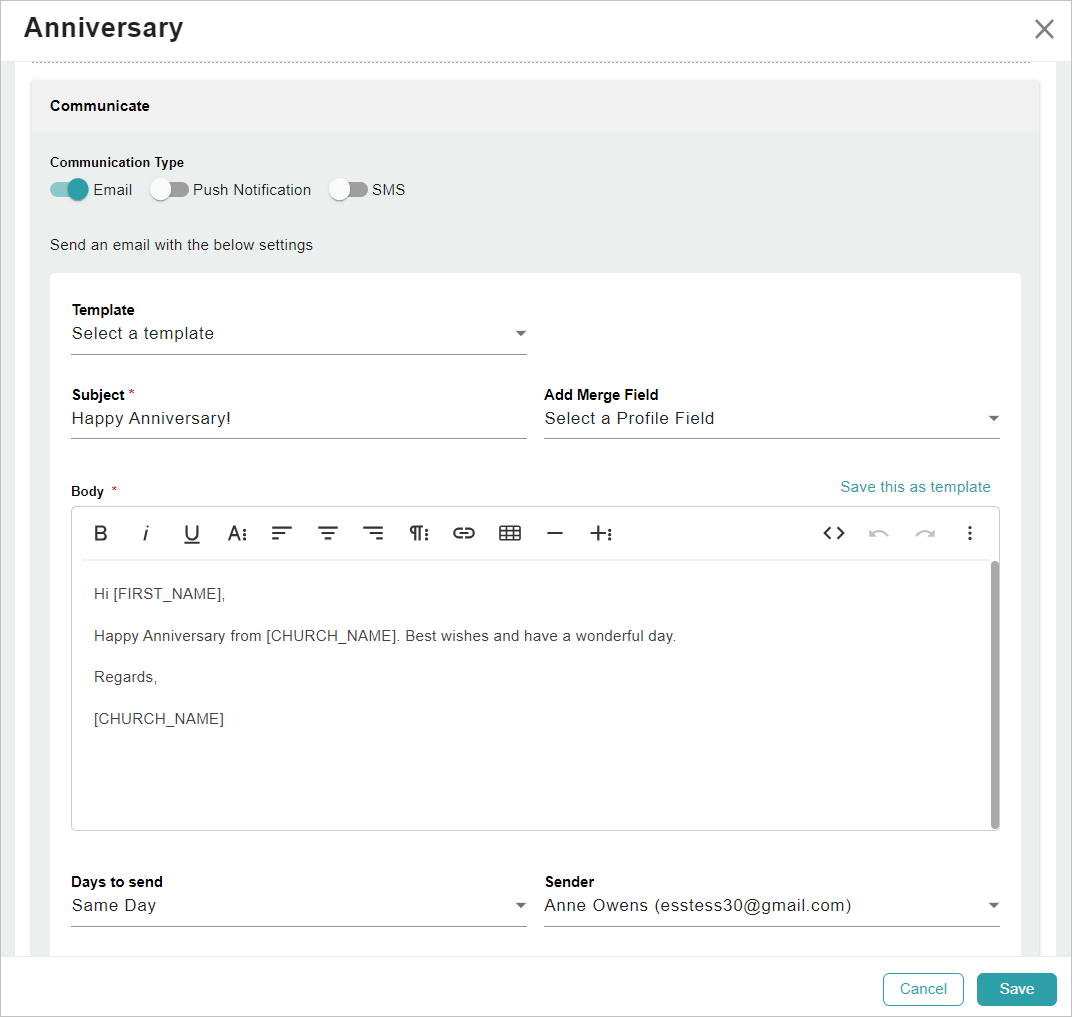 - Configure the Task to run. The only action this task can perform is to send communications. You can choose to send an Email, Push Notification, or SMS. You can check all options and edit the contents of each type of message. You can choose whether to send the communication on the same day as configured; or after a set number of days. You can also select the sender - either the main church admin or your own account, if different.