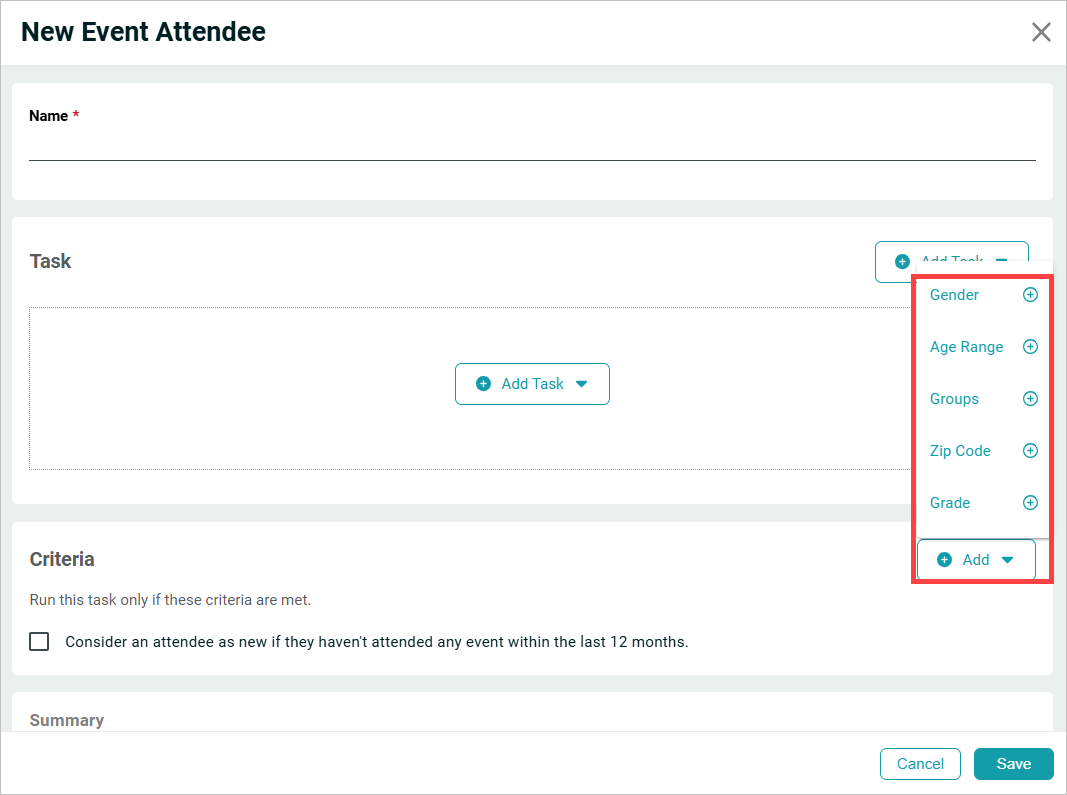 For the New Event Attendee task, the criteria also give you the option to Consider an attendee as new if they haven't attended any event within the last 12 months. - Save the task when ready.